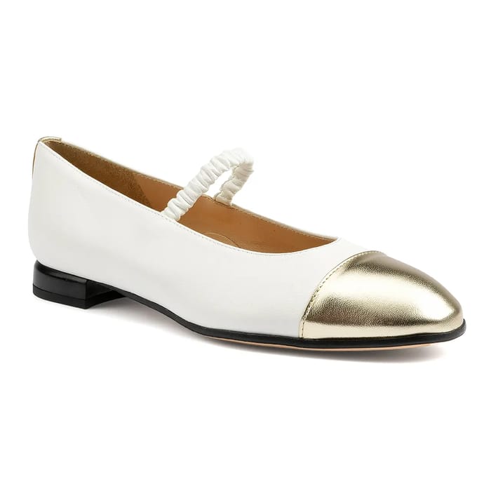 Les ballerines Y1-B de Brunate sont conçues pour un port quotidien, professionnel ou décontracté. Cette paire de chaussures est élégante et pratique, avec un talon de 15 mm et une semelle en cuir pour une sensation de confort. Le dessus et la tige sont en cuir, tandis que la tige est également métallisée en or pour un toucher de luxe. La doublure et la semelle intérieure sont également en cuir, offrant une douceur et une qualité supérieures. La couleur blanche est idéale pour une paire de chaussures versatile et facile à combiner avec vos tenues. Les détails de cette paire de chaussures, comme la ballerine en cuir et la semelle en cuir, soulignent son style décontracté et chic. -