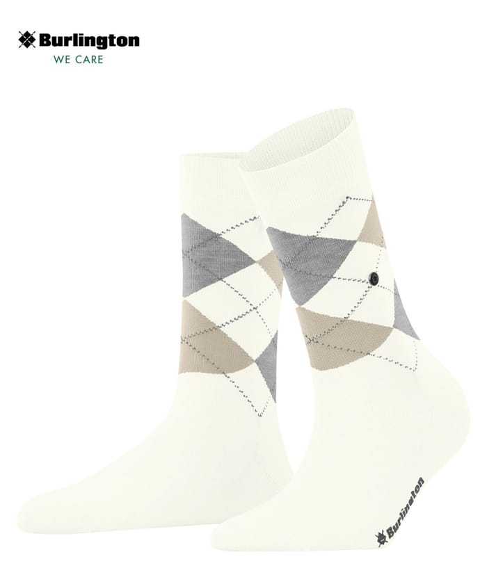 Les chaussettes de ville W's COVENT GARDEN de la marque Burlington allient élégance et confort au quotidien. Confectionnées à partir d'un mélange de 84 % coton organique et 16 % polyamide, elles offrent une finesse remarquable ainsi une respirabilité optimale tout au long de la journée. Leur tige en blanc cassé met en valeur un motif géométrique classique en argyle, composé de losanges reliés par des lignes pointillées dans des tons de gris et beige. Une touche distinctive est apportée par le logo Burlington, gravé en noir près du talon sur une des chaussettes, accompagné du slogan "WE CARE". Idéales pour le bureau, les sorties ou les moments informels, ces chaussettes s'inscrivent dans une gamme de produits élégants et intemporels, parfaites pour compléter une tenue sobre et soignée. -