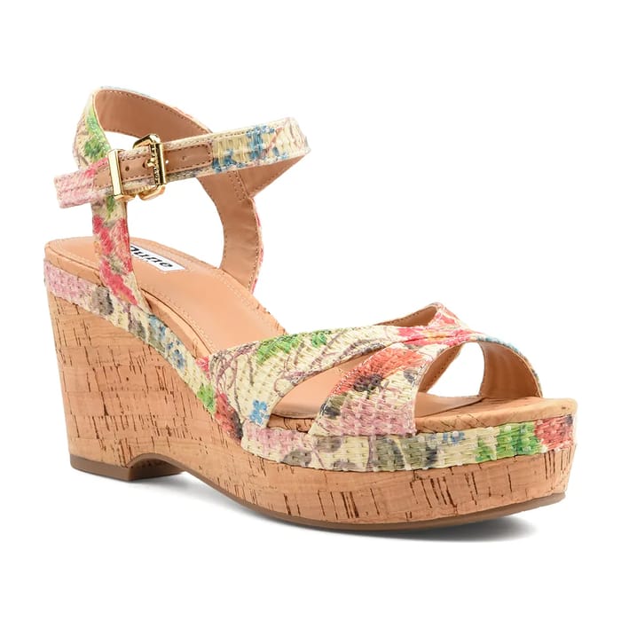 Découvrez les sandales Kelulu de la marque Dune, idéales pour les soirées et les sorties estivales. Ces sandales compensées en synthétique offrent un style féminin et une allure tendance. Le talon mesure 90 mm et est en gomme, tandis que la semelle intérieure et la doublure sont également en synthétique. Le dessus de la sandale est également en synthétique et présente un design à lacets croisés, orné d'un motif tissé multicolore en rose, vert, bleu et jaune. Un fermoir en ton or est visible sur la lacet de l'ankle pour un ajustement facile. Les sandales Kelulu sont parfaites pour les femmes qui cherchent un confort et une stabilité tout en étant à la mode. -