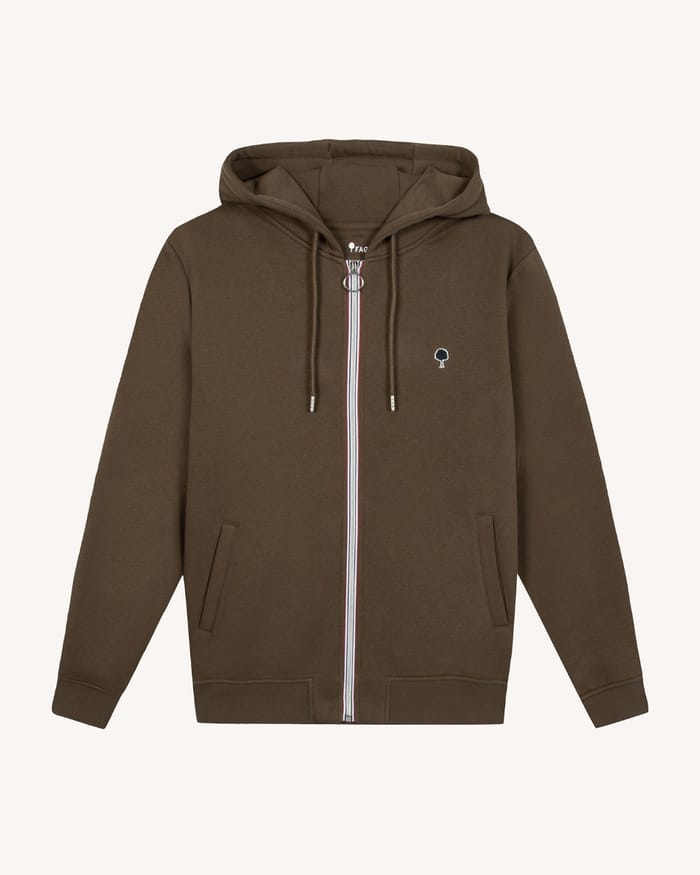 Le M's MESNIL de la marque Faguo est une sweat-shirt décontracté et chaleureux conçu pour le quotidien et les moments de détente. Ce hoodie en brun met en valeur un style cosy et fonctionnel, idéal pour les loisirs et les activités au quotidien. Doté d'une capuche avec des ourlets à la taille, il offre un confort optimal et une polyvalence remarquable. Un zip argenté couvre toute la longueur du vêtement, accompagné de deux poches latérales à niveau des hanches pour un accès pratique. Un petit dessin en bleu représentant une petite plante ou arbre est brodé sur l'avant, juste à gauche du torse, ajoutant un détail personnel et élégant. Les manches et le bas du vêtement sont ornés de tissus en maille à texture, renforçant le confort et l'aspect doux. Une étiquette en lettres blanches sur le col affiche les informations de marque, complétant l'identité du produit. -