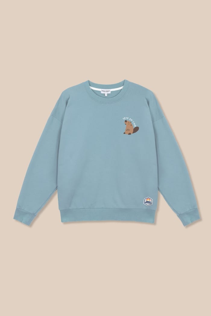 Le sweat-shirt K's TÊTE EN L'AIR de la marque French Disorder est un vêtement décontracté et cosy, idéal pour les activités quotidiennes, la détente et les loisirs. Confectionné en 100% de coton bio, il offre un confort optimal tout en étant respectueux de l'environnement. Le col rond et les manches longues assurent une chaleur et un confort constants. Le sweat-shirt est disponible en bleu ciel, une couleur rafraîchissante et éclatante. Le design est sobre et élégant, avec un petit motif brodé représentant un castor avec la phrase "TÊTE EN L'EAU" sur sa tête. Un logo supplémentaire est apposé près du bas droit de l'avant. Le sweat-shirt est également équipé de coudes et de jambes en tricot, pour une tenue et une chaleur optimales. -