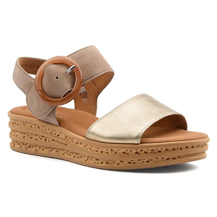 Découvrez les sandales compensées Gabor 64-550, idéales pour les soirées et les sorties estivales. Cette paire de sandales est conçue pour offrir un maximum de confort tout en affichant un style élégant. Le dessus en cuir velours et le talon en cuir métallisé donnent à ces sandales une touche de sophistication, tandis que la doublure en cuir assure une douceur supplémentaire. Les semelles intérieures en cuir et les semelles extérieures en synthétique garantissent une stabilité et une flexibilité optimales. Les sandales Gabor 64-550 sont disponibles dans une gamme de couleurs multicolores, ce qui les rend parfaites pour accompagner vos tenues estivales. Les deux bandes de cuir, l'une large et métallisée à l'avant et l'autre plus fine et en cuir beige à l'arrière, s'ajustent parfaitement à votre pied. La boucle en cuir brun foncé ajoute une touche de classe à cette paire de sandales. Les sandales Gabor 64-550 sont conçues pour vous offrir un maximum de confort tout en étant à la mode. Avec leur talon de 40 mm et leur semelle en synthétique, vous pourrez vous déplacer avec aisance tout en affichant un style élégant. Ces sandales sont idéales pour les sorties estivales, les soirées ou tout simplement pour une journée ensoleillée. Les sandales Gabor 64-550 sont une excellente option pour les femmes qui cherchent à se démarquer tout en étant confortables. Avec leur style contemporain et leur attention aux détails, ces sandales sont une paire de chaussures de qualité qui vous accompagnera tout au long de l'été. -