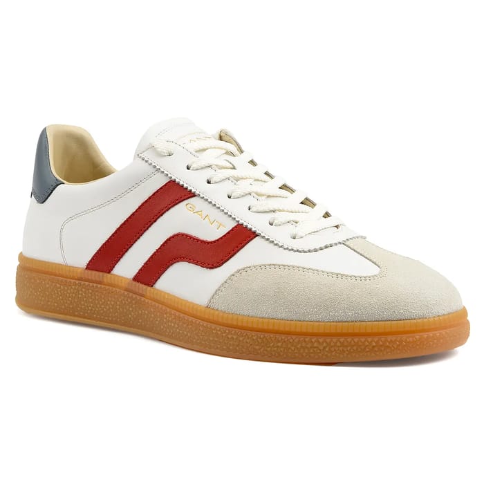 Les chaussures Cuzmo de la marque Gant sont des chaussures à lacets classiques et polyvalentes, idéales pour l'usage quotidien, les sorties et le bureau. Leur dessus et tige sont faits en cuir et daim, offrant un mélange de style et de confort. La doublure est composée de textile et de cuir, assurant une protection supplémentaire et une sensation de confort. Les semelles intérieures sont en cuir, tandis que les semelles extérieures sont en gomme, offrant une durabilité et une flexibilité optimales. Les détails de ces chaussures comprennent une sneaker en cuir et cuir velours, ajoutant une touche de sophistication et de style. La couleur principale est le blanc, avec des accents en cuir velours et des touches de cuir. Un logo rouge "H" est visible sur le côté, tandis que le nom "GANT" est inscrit en lettres d'or près du haut de la languette. Un tablier de talon en matière sombre bleue est également présent pour une meilleure confort. -