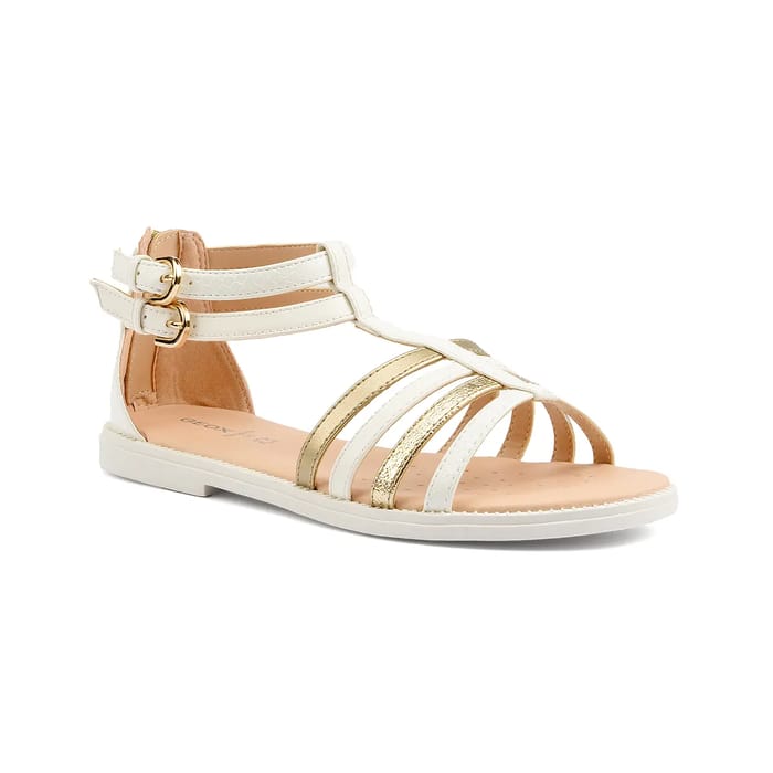 Découvrez les Sandales Karly de Geox, idéales pour les journées estivales. Ces sandales plates en synthétique présentent un design décontracté et élégant, avec deux larges bandes métalliques dorés qui s'étendent sur le dessus du pied et trois fines bandes blanches qui s'enroulent autour du talon, sécurisées par un petit cadenas. La doublure en cuir et synthétique garantit un confort optimal, tandis que la semelle en gomme offre une légèreté et une respirabilité exceptionnelles. La semelle intérieure en cuir ajoute une touche de sophistication. Les détails de la sandale en synthétique ajoutent une touche de modernité. Les Sandales Karly sont disponibles en blanc, une couleur idéale pour les journées estivales. Elles conviennent parfaitement pour une plage, des vacances ou un usage quotidien. -
