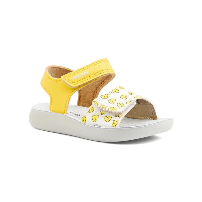 La sandale LIGHTFLOPPY de Geox est une chaussure estivale décontractée qui convient parfaitement à la plage, aux vacances ou à l'usage quotidien. Cette sandale plates est conçue pour offrir un confort optimal, grâce à sa semelle intérieure en cuir velours et à sa semelle en gomme. Le dessus et la tige sont en synthétique, tandis que la doublure est en textile. La couleur jaune est accentuée par des petits cœurs blancs sur un fond blanc au niveau de la bandoulière supérieure, tandis que la bandoulière postérieure est entièrement jaune avec une couture visible. Le logo "GEOX" est brodé sur cette dernière, près de l'ouverture de la chaussure. Cette sandale est légère, respirante et confortable, ce qui en fait un choix idéal pour les enfants qui aiment jouer et courir librement. -