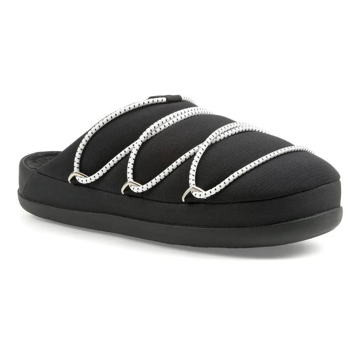 Les pantoufles MB SOFT SLIPPER de Moon Boot allient confort et style dans une proposition idéale pour la maison ou les moments de détente en hiver. Confectionnées dans un textile doux et résilient, elles offrent une douceur immédiate grâce à leur doublure et semelle intérieure en textile. La semelle extérieure en EVA et caoutchouc assure une souplesse optimale et une chaleur renforcée, parfaitement adaptée aux ambiances intérieures. Le design épuré en noir met en valeur un dessus texturé avec trois bandes élastiques blanches ornées de petits trous réguliers, fixées par des crochets métalliques au niveau de la semelle. Ce détail technique ajoute une touche fonctionnelle sans compromettre le bien-être global. Ces pantoufles s’adaptent naturellement à un usage quotidien, offrant une sensation de légèreté et de confort tout au long de la journée. -