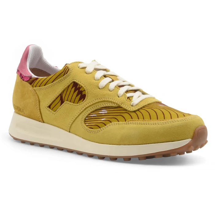 Les sneakers Arusha de la marque Panafrica allient élégance et durabilité pour un style urbain intemporel. Conçues en cuir velours et en coton recyclé, elles marient douceur et résistance, tout en s’inscrivant dans une démarche écologique. Leur doublure textile assure un confort optimal, tandis que la semelle intérieure amovible et en textile permet une adaptation parfaite à la morphologie du pied. La semelle en gomme offre une stabilité renforcée pour des pas fluides, que ce soit au quotidien, pour une balade ou lors d’activités loisirs. Le design audacieux de ces sneakers se distingue par une palette multicolore mettant en valeur un jaune moutarde vibrant, des lacets blancs et des bandes brunes latérales qui dynamisent la silhouette. Un détail rose au niveau du collier du talon et l’inscription "RUSHA" gravée près de l’arrière-pied ajoutent une touche d’originalité. Parfaitement adaptées à un usage polyvalent, ces sneakers incarnent l’alliance idéale entre mode et confort, pour un look tendance qui s’adapte à toutes les occasions. -