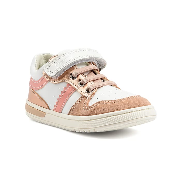 Les bottines Baby Dude de Primigi sont conçues pour les petits pieds en utilisant un mélange de matériaux blanc et rose pâle. Elles disposent d'une fermeture à velcro au sommet, complétée par des lacets traditionnels de même couleur pour une sécurité renforcée. Le design inclut des perforations dans la zone du talon pour une meilleure ventilation. La semelle est en caoutchouc avec un motif texturé pour une meilleure prise. La partie supérieure est composée de matériau synthétique lisse autour du collier du talon et de sections de cuir ou de faux-cuir près du capuchon du talon et des côtés. Des détails de couture décoratifs ajoutent à son attrait esthétique. Ces bottines sont conçues pour un usage général et quotidien, offrant un maintien, un confort et une durabilité. -