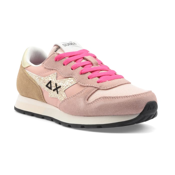 Ces sneakers Sun68 Girl's Stargirl Glitter allient élégance et originalité pour un look tendance qui s’adapte à toutes les occasions. Conçues spécialement pour les jeunes filles, elles marient un dessus en daim textile doux et résistant, parfait pour un confort optimal au quotidien. La doublure textile assure une touche supplémentaire de douceur, tandis que la semelle intérieure amovible et textile permet un ajustement personnalisé pour un maintien parfait. Le design se distingue par des détails soignés : un panier avant en cuir velours et textile, des lacets d’un rose vif qui apportent une touche de dynamisme, et une décoration scintillante en forme d’étoile sur le côté, accompagnée de la mention "4X" en lettres noires pour un effet graphique unique. La semelle en gomme offre une stabilité et une durabilité accrues, idéale pour la marche ou les loisirs. Disponibles dans une teinte rose qui incarne la fraîcheur et la joie, ces sneakers s’intègrent parfaitement dans une garde-robe moderne. Leur polyvalence en fait des alliées pour tous les moments, que ce soit pour une balade en ville, une sortie entre amies ou une journée détente. Le mélange de matériaux et de couleurs en fait un incontournable pour celles qui aiment allier style et confort. -