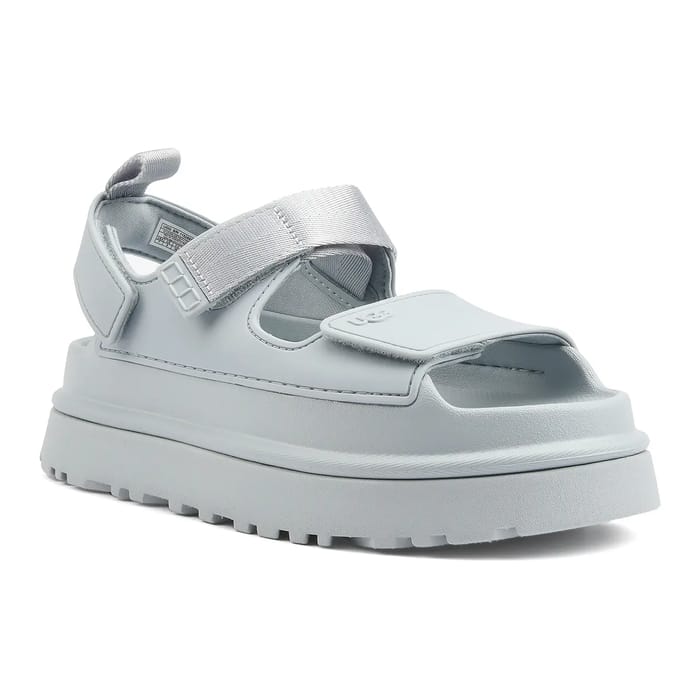 Les sandales W Golden Glow de la marque UGG sont conçues pour un confort et une légèreté optimales. Fabriquées en EVA, elles disposent d'une doublure en polyester recyclé et d'une semelle intérieure en EVA. La semelle extérieure en canne à sucre garantit une tenue estivale idéale. Ces sandales plates sont disponibles en bleu ciel et conviennent parfaitement à une gamme de produits décontracté et estival. Elles sont idéales pour les plages, les vacances ou les journées quotidiennes. Les W Golden Glow combinent la mode et le confort, ce qui en fait un choix iconique pour les fashionistas. -