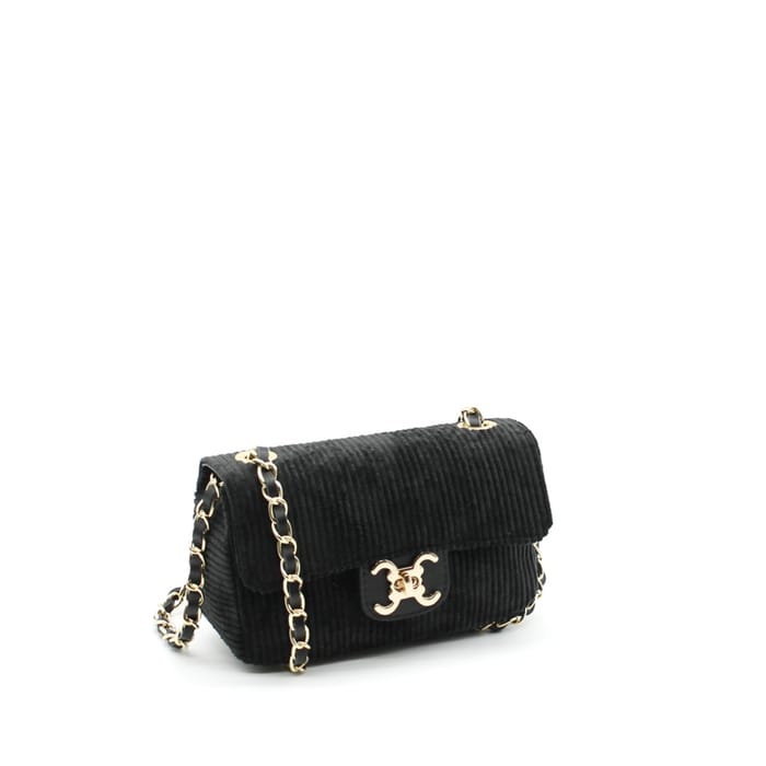 Ce sac à rabat Vimoda 390272 allie élégance et praticité dans un design classique. Sa doublure en cuir apporte une touche de luxe, tandis que son extérieur en tissu corduroy texturé offre une esthétique raffinée. Le fermoir en métal doré orné du double C emblématique assure une fermeture sécurisée, renforçant l’aspect fonctionnel du sac. Doté d’une bandoulière en chaîne dorée ajustable, il se porte aussi bien en bandoulière qu’à la main. Deux petits anneaux métalliques sur les côtés permettent de fixer la chaîne de manière pratique. Discret et élégant, ce sac noir convient aussi bien pour le bureau que pour les sorties ou une utilisation quotidienne. Son intérieur spacieux facilite le rangement, et sa finition soignée en fait un accessoire incontournable pour compléter une tenue avec style. -